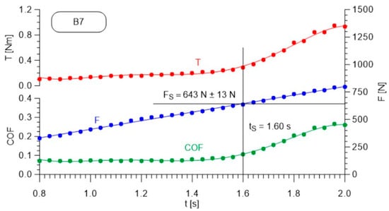 Averaged profiles of the tribosystem load F, friction torque T, and COF for B7 fuel.