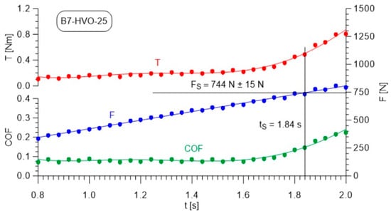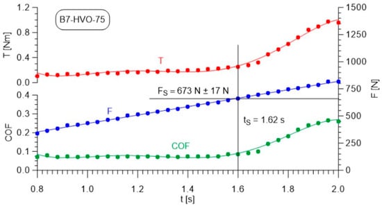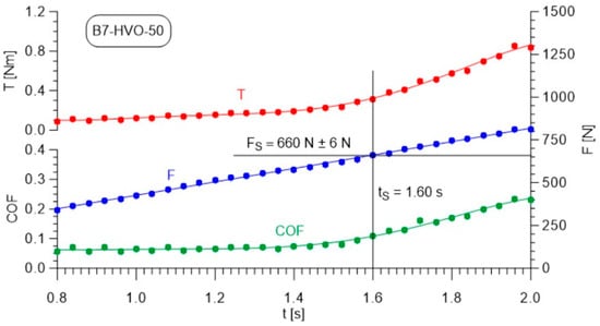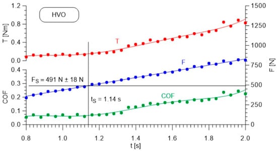 Figure 8 presents the data obtained for neat HVO. As shown, this fuel exhibited the lowest scuffing load (FS = 491 N). Therefore, the lubricity evaluation method based on the scuffing load also clearly confirmed the significantly poorer lubricating properties of this fuel compared to B7. In this respect, the findings align with the results obtained using the HFRR method, presented in [29], which also demonstrated noticeably lower lubricity of HVO relative to diesel. The inferior lubricity of HVO compared to diesel is attributed to the absence of aromatic and olefinic hydrocarbons in HVO, as well as the removal of oxygen during the hydrotreatment process. As shown in Table 5, HVO exhibited a 24% decrease in FS compared to B7, which, under continuously increasing load conditions in the friction node, also translated to the shortest time to scuffing initiation (tS = 1.14 s).
