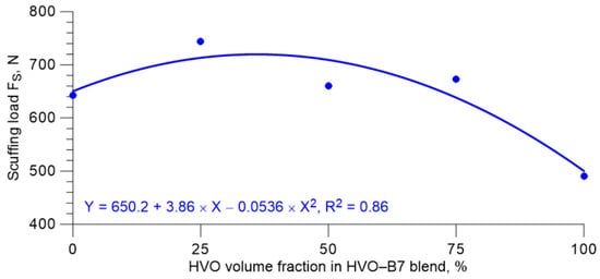 As shown in Figure 9, despite the well-documented inferior lubricity of neat HVO compared to conventional diesel, the scuffing load values observed in the present study did not decrease monotonically with increasing HVO content in the HVO–B7 blends. Instead, a non-linear trend was evident: FS initially increased with the addition of HVO, indicating a temporary improvement in lubricating performance. This behavior was likely due to synergistic effects between the additive components of B7 and moderate HVO concentrations, which may have stabilized the lubricating film during boundary lubrication. At higher HVO volume fractions, the scuffing load stabilized or slightly decreased, and for neat HVO, the lowest FS value was recorded, which aligned with its expected poor lubricity due to the absence of naturally lubricating compounds such as aromatic hydrocarbons or polar oxygenates.