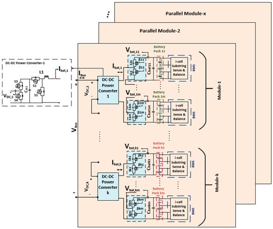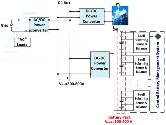 One of the common configurations for connecting BESSs in a DC-coupled system, for example, with a photovoltaic (PV) source is shown in Figure 1. In such systems, the DC bus voltage typically operates within a range of 300 V to 600 V, while the nominal battery voltage generally varies from 100 V to 400 V, depending on the specific application and system design parameters [8]. Individual battery cell voltages generally range from 1 to 4.5 V, with nominal values depending on the cell chemistry; for example, approximately 1.25 V for Nickel Metal Hybrid (NiMH), 2 V for lead-acid, 2.1 V for sodium-sulfur (NaS), 3.6 V for nickel manganese cobalt (NMC), and 3.3 V for lithium iron phosphate (LiFePO4) cells [9,10]. To achieve the required voltage levels, multiple cells are connected in series to form a battery pack. However, mismatches between cells in battery packs are inevitable due to variations in intrinsic resistance, self-discharge rates, and capacity caused by manufacturing tolerances. Over repeated charge–discharge cycles, these mismatches are exacerbated by unequal power losses, thermal gradients, and external circuitry for sensing and protection. Since pack performance is limited by the weakest cell, early charge termination leads to underutilized capacity, while early discharge cutoff results in energy loss. In addition, the overcharging or deep discharging of individual cells accelerates degradation and poses safety risks [11]. To address these issues, battery management systems (BMSs) implement cell balancing for series connected cells.