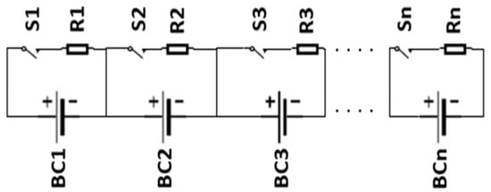Several cell balancing topologies have been proposed in the literature. Dissipative balancing, shown in Figure 2, is the simplest and cheapest one, where surplus charges from higher-voltage cells are diverted through resistors, typically controlled by MOSFETs, and dissipated as heat [12]. However, the excess energy is dissipated as heat, resulting in a low energy efficiency. In addition, in practice, the balancing current is restricted to several mA to prevent excessive heat generation, and the resultant balancing speed is slow with this limited current, especially for higher power application.