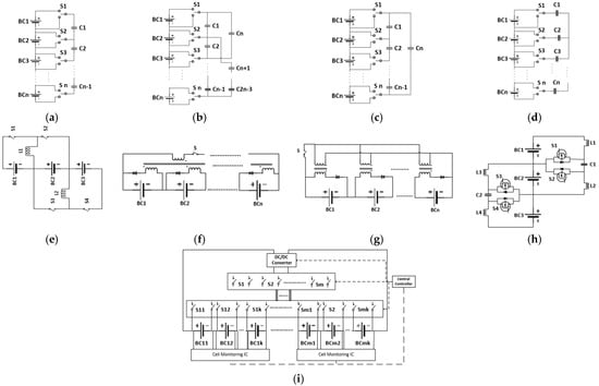 Energy-transferring cell-balancing topologies: (a) SC, (b) Double-Tiered SC, (c) Chain Structure, (d) Optimized SC, (e) Multi-Inductor, (f) Multi-Winding Transformer, (g) Multiple Transformer, (h) Cuk Converter, (i) Single Converter for modularized cells.