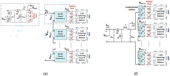 Modularized battery packs/cell: (a) modular multilevel-series/parallel-converter-based BESS, (b) Modular Reconfigurable BESS, (c) Multi-Transformer-based BESS, (d) boost-multilevel converter-based BESS, (e) modular BESS, (f) multi-port-converter-based BESS.