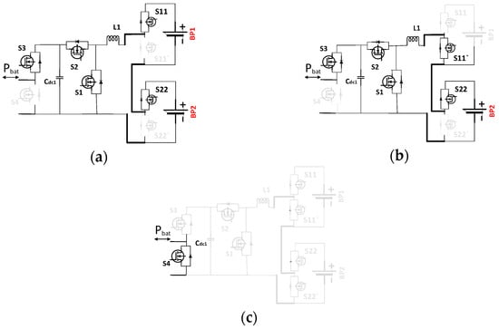 Equivalent circuits for a two-port converter under different operating modes are shown in Figure 6. To connect a battery pack (e.g., BP1), switch S11 is turned on while the disable switch (S11’) is turned off, and vice versa. Figure 6a,b show the equivalent circuits when no battery packs are bypassed and when BP1 is bypassed, respectively. Switches S3 and S4 of each two-port converter module manage the connection or bypassing of the entire module, as illustrated in Figure 6c.
