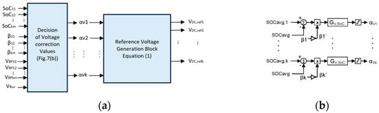 An SoC-based power sharing controller is proposed for the MMPC-based BESS. Module-level balancing is achieved by adjusting the power output of individual k multi-port converters. During discharging, modules with a higher SoC are assigned higher power outputs, while those with a lower SoC contribute less, promoting SoC equalization across modules. Since all converters are connected in series on the DC bus side, the same current flows through each converter. Therefore, power differences are realized by varying the output voltages of individual converters. To do this, the average SoC of all modules from to is compared to the overall system average SoC (). A proportional controller then generates voltage correction terms for all modules from to to adjust its DC bus-side reference voltage accordingly, as shown in Figure 7a. Bypassed battery packs are excluded from the modules’ average SoC calculation to ensure a decoupled control strategy. As pack level balancing is independently handled within each module, the controller focuses on module-level balancing. The DC bus side voltage of each module is scaled in proportion to its total battery voltage, allowing discharging power to be distributed according to the SoC of the active modules. To ensure the overall DC bus voltage remains constant, the sum of the voltage correction values, , is subtracted from the individual reference voltages. The DC bus voltage of module-x is calculated as follows: