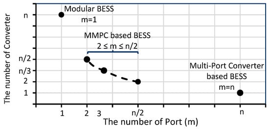 As depicted in Figure 9, three converter architectures are compared for a system with n battery packs, where the modular BESS employs n single-port converters (m = 1), while the multi-port-converter-based BESS uses a single converter with m = n ports. The proposed MMPC-based BESS lies between the modular and multi-port-converter-based BESSs.
