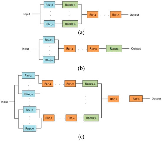 Reliability block diagrams: (a) modular BESS, (b) multi-port-converter-based BESS, (c) MMPC-based BESS.