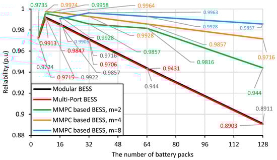 To assess the reliability of each system configuration, corresponding reliability block diagrams are constructed and illustrated in Figure 10. In these diagrams, , , and are the reliabilities of the battery, bi-directional DC–DC converter, and bypass arrangements, respectively. In all configurations, the battery packs are independently integrated into the system and can be selectively bypassed during abnormal operating conditions via control of the bypass switches. Consequently, battery packs are modeled as parallel components, while their respective bypass arrangements are represented in series within the reliability block diagrams. In contrast to the modular BESS and MMPC-based BESS architectures, the multi-port-converter-based BESS depends on a single centralized converter, making its reliability a critical factor. The reliability functions for the modular BESS, multi-port-converter-based BESS, and MMPC-based BESS with n battery packs are derived using (5) and (6), and are explicitly given by (7), (8), and (9), respectively. Reliability analyses are performed for varying numbers of battery packs, as well as different numbers of converter ports in the MMPC-based BESS. The comparative reliability results for each architecture under these varying conditions are presented in Figure 11.