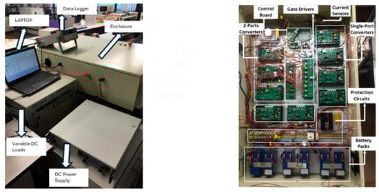 To verify the power sharing capability of MMPC-based BESS developed in this paper, an experimental prototype comprising six LiFePo4 packs (Shenzhen, China) and three dual-port converters was built. Figure 12 shows the experimental setup. The experimental results for the modular BESS configuration utilizing six designed single-port converters are also presented. In MMPC-based BESS, each designed dual-port DC–DC converter is responsible for two battery packs, each rated at 12.8 V and 10 Ah. The control method was realized in a TMS320F28377d Texas Instrument digital signal processor (Dallas, TX, USA). The system was tested in both charging and discharging modes with initial SoC mismatches to prove the SoC balancing ability. The initial SoCs of each battery pack and the charging/discharging currents are summarized in Table 3.