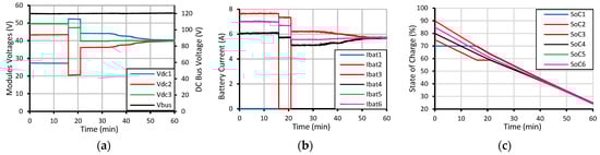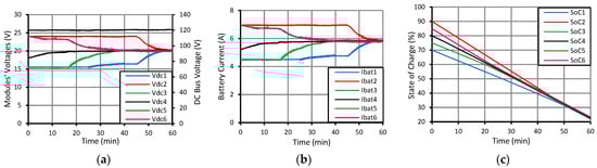 Experimental results of modular BESS in discharging mode: (a) module’s DC bus side voltages; (b) charging current of each battery pack; (c) SoC of each battery pack.