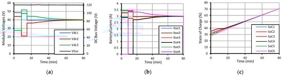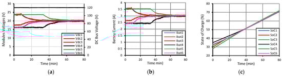 Experimental results of modular BESS in charging mode: (a) module’s DC bus side voltages; (b) charging current of each battery pack; (c) SoC of each battery pack.