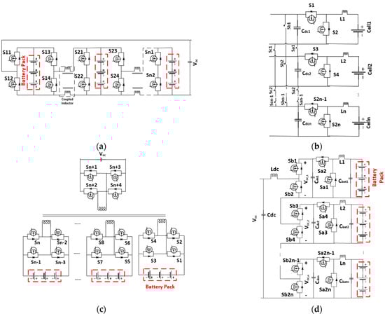 One of the common configurations for connecting BESSs in a DC-coupled system, for example, with a photovoltaic (PV) source is shown in Figure 1. In such systems, the DC bus voltage typically operates within a range of 300 V to 600 V, while the nominal battery voltage generally varies from 100 V to 400 V, depending on the specific application and system design parameters [8]. Individual battery cell voltages generally range from 1 to 4.5 V, with nominal values depending on the cell chemistry; for example, approximately 1.25 V for Nickel Metal Hybrid (NiMH), 2 V for lead-acid, 2.1 V for sodium-sulfur (NaS), 3.6 V for nickel manganese cobalt (NMC), and 3.3 V for lithium iron phosphate (LiFePO4) cells [9,10]. To achieve the required voltage levels, multiple cells are connected in series to form a battery pack. However, mismatches between cells in battery packs are inevitable due to variations in intrinsic resistance, self-discharge rates, and capacity caused by manufacturing tolerances. Over repeated charge–discharge cycles, these mismatches are exacerbated by unequal power losses, thermal gradients, and external circuitry for sensing and protection. Since pack performance is limited by the weakest cell, early charge termination leads to underutilized capacity, while early discharge cutoff results in energy loss. In addition, the overcharging or deep discharging of individual cells accelerates degradation and poses safety risks [11]. To address these issues, battery management systems (BMSs) implement cell balancing for series connected cells.