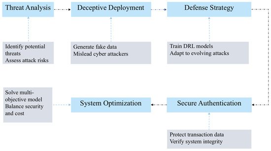 As shown in Figure 1, the framework is composed of five major steps: threat analysis, deceptive deployment, defense strategy formulation, secure authentication, and system optimization. Each step incrementally strengthens the cyber-resilience of PV grids by combining proactive deception, adaptive learning, secure data validation, and multi-objective optimization techniques, ensuring a balanced trade-off between security enhancement and operational efficiency.