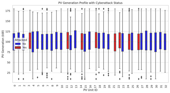 Figure 3 presents the impact of cyberattacks on PV generation across 33 PV units, where approximately 12 units (35%) are under attack. The power output of attacked PV units fluctuates between 50 kW and 160 kW, while non-attacked units remain more stable in the range of 80 kW to 200 kW. The increased variance and lower median power output among compromised PV units indicate the destabilizing effects of cyberattacks, particularly false data injection attacks (FDIAs), which manipulate control signals and disrupt energy dispatch. This discrepancy suggests that adversarial manipulations lead to inefficient resource utilization, possibly causing overvoltage or undergeneration issues in the microgrid. Additionally, the boxplot highlights that attacked PV units frequently experience outliers, reflecting erratic behavior that can introduce instability into the broader distribution network.