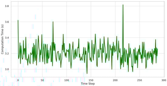 Figure 5 evaluates the computational efficiency of the reinforcement learning (RL)-driven cyber-defense framework. The RL training time remains consistent at an average of 3.2 s per iteration, fluctuating within ±0.1 s under normal conditions. However, noticeable slowdowns occur every 72 time steps, where training time increases to as much as 3.7 s. These periodic slowdowns likely correspond to more complex adversarial strategies requiring additional policy updates and deeper exploration of the state-action space before convergence. The RL model’s adaptive learning process ensures that it refines its cyber-defense tactics in response to evolving attack patterns, optimizing the engagement of digital twins in deceiving adversaries. The results indicate that despite occasional computational spikes, the RL-based defense remains computationally feasible for real-time grid security applications, ensuring that cyber-resilient PV operation is both dynamically responsive and scalable.