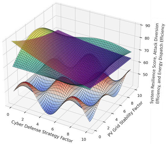 Figure 6 presents a multi-layer 3D surface visualization of key performance metrics in a cyber-resilient PV-integrated grid under different operating conditions. The three layers correspond to system resilience score, attack diversion efficiency, and energy dispatch efficiency, mapped against cyber defense strategy factors and PV grid stability factors. The system resilience score fluctuates between 50 and 95, indicating the grid’s ability to recover from cyberattacks. In contrast, attack diversion efficiency varies between 60% and 98%, reflecting the effectiveness of digital twin deception in misleading adversaries. The energy dispatch efficiency remains within the 70% to 98% range, showcasing how well the grid maintains optimal power distribution under different security implementations. The multi-layer approach allows a direct performance comparison across different cyber-defense strategies, helping to identify the optimal trade-off between security effectiveness and operational efficiency. The visualization reveals important trends in cyber-resilience strategies. The system resilience layer shows a steady improvement with increasing security complexity, achieving the highest values when full cyber-resilient optimization is applied. However, attack diversion efficiency exhibits a non-linear pattern, with significant improvement when digital twin deception is introduced, jumping from 60% to over 80% under reinforcement learning-based cyber defense. The energy dispatch efficiency layer highlights a delicate balance between security and performance, where excessive security mechanisms introduce slight operational inefficiencies due to computational overhead, as seen in minor fluctuations around 95% efficiency when blockchain authentication and reinforcement learning algorithms are combined. These variations suggest that while security interventions enhance resilience, they must be fine-tuned to minimize their impact on real-time energy operations.