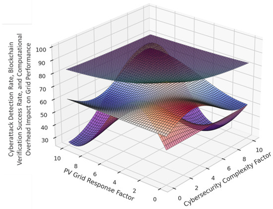 Figure 7 presents a multi-layer 3D visualization of how different cybersecurity mechanisms influence power grid performance. The three layers represent cyberattack detection rate, blockchain verification success rate, and the impact of computational overhead on grid performance. The cyberattack detection rate fluctuates between 60% and 98%, showing how effectively different security measures identify and respond to cyber threats. The blockchain verification success rate varies from 80% to 99%, indicating how well the system maintains secure transactions despite cyber threats. The computational overhead impact on grid performance ranges between 50 and 85, reflecting how increasing security complexity influences real-time grid operation efficiency. By analyzing these three metrics together, the figure provides insight into the trade-offs between strengthening cybersecurity and maintaining stable grid operations. A deeper look at the cyberattack detection rate layer reveals a strong correlation with system complexity. When simple security mechanisms are used, the detection rate remains between 60% and 75%, meaning that a significant portion of attacks bypass security measures. However, as more advanced detection techniques such as reinforcement learning-based intrusion detection are applied, the detection rate reaches above 95%, significantly improving system resilience. The blockchain verification layer shows a steady success rate above 90%, with only minor fluctuations due to variations in network congestion. However, certain cybersecurity mechanisms slightly reduce verification efficiency, with occasional dips to around 85%, particularly when additional computational burdens are introduced by real-time authentication requirements.