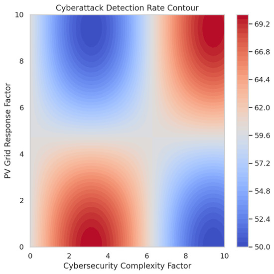 Figure 8 illustrates how attack detection effectiveness varies with cybersecurity complexity and PV grid response factors. In regions with low-security complexity, the detection rate remains between 60% and 75%, making the system vulnerable to undetected attacks. As advanced cyber-defense mechanisms such as reinforcement learning-based intrusion detection are introduced, detection rates improve significantly, surpassing 90% in mid-to-high complexity scenarios. At peak optimization, the detection rate reaches 98%, ensuring that almost all cyber threats are identified before they can impact grid operations. The contour plot also shows some transitional regions where detection fluctuates, indicating that moderate security configurations may require fine-tuning to ensure stability.