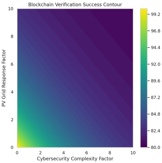 Figure 9 maps the effectiveness of blockchain-based authentication under varying cybersecurity and grid response conditions. The success rate remains above 90% in most scenarios, confirming that blockchain-based validation is highly reliable. However, as cybersecurity complexity increases, additional computational loads and network congestion slightly reduce verification success in certain areas, causing minor dips to 85–87%. This suggests that while blockchain ensures transaction security, its implementation must be optimized to avoid excessive processing delays. The contour map highlights that under high-load conditions, the trade-off between security strength and processing efficiency must be carefully balanced to prevent bottlenecks in authentication.
