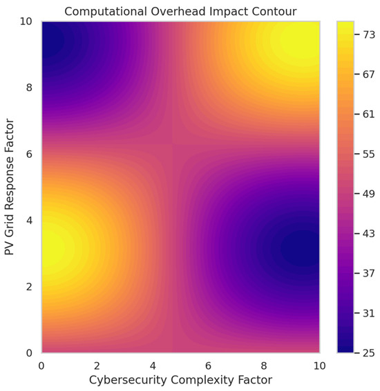 Figure 10 provides insights into how cybersecurity complexity affects real-time grid performance. When minimal security measures are applied, operational efficiency remains above 85%, ensuring smooth energy dispatch. However, as security complexity increases, the computational burden grows, leading to a gradual decrease in efficiency. The contour map shows that in high-security configurations combining blockchain, digital twins, and reinforcement learning-based defenses, efficiency drops to around 50–60%. This result suggests that excessive security measures can introduce delays in real-time grid operations, requiring optimization strategies to reduce computational overhead while maintaining robust cybersecurity. The visualization confirms that an optimal trade-off must be achieved between security robustness and system performance.