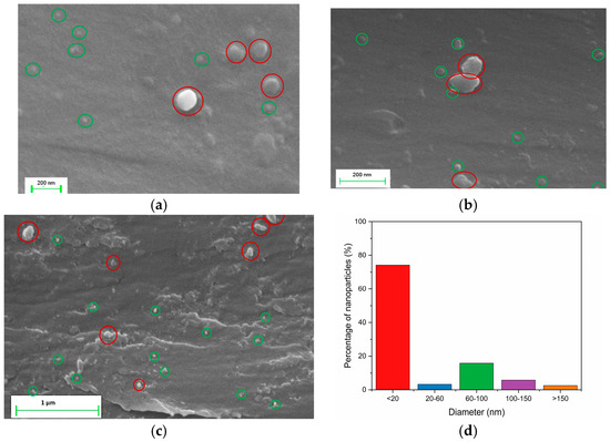 SEM images for the nanocomposites with (a) 3 phr carbon black/20 phr Fe3O4; (b) 5 phr carbon black/20 phr Fe3O4; and (c) 5 phr carbon black/20 phr Fe3O4 (low magnification). Green cycles denote the carbon black nanoparticles, while red cycles indicate the Fe3O4 nanoparticles. (d) Bar chart presenting the percentage of nanoparticles as a function of their diameter.