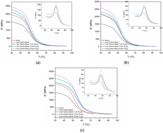 The variation of the storage modulus as a function of temperature for the hybrid nanocomposites with (a) 1; (b) 3; and (c) 5 phr carbon black concentration, varying the magnetite content. Insets depict the respective loss modulus as a function of temperature.