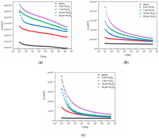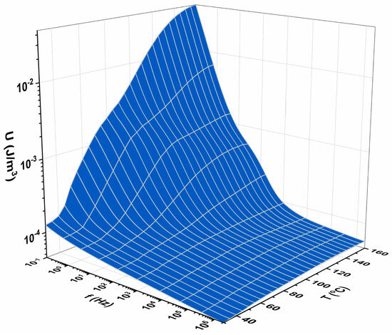 Figure 3 presents the three-dimensional representation of the dependence of the energy density on the frequency and temperature for the nanocomposite with 3 phr carbon black/10 phr Fe3O4 content. The variation of U shown in Figure 3 is representative of the behavior of all studied systems. The induced polarization, as expressed by the variation of the dielectric permittivity values, significantly decreases with frequency, since the permanent and induced dipoles, within the material, fail to follow and align with the rapid oscillations of the externally applied electric field vector. In contrast to the frequency, an increase in temperature results in higher mobility of the polymer chains due to the thermal excitation, hence facilitating their orientation with the field and leading to increased values of the real part of the dielectric permittivity and, therefore, the energy density values. The maximum values of U are recorded at high temperatures and low frequencies due to the occurrence of interfacial polarization. The process of interfacial polarization, known also as the Maxwell–Wagner–Sillars effect, is the result of the electrical heterogeneity between the matrix and the inclusions and the accumulation of mobile charges at the interface between the matrix and the fillers. This leads to the formation of large dipoles, which require sufficient time, combined with adequate thermal excitation, to align with the external field. In the region of intermediate temperatures and frequencies, a process is recorded in the form of a “shoulder,” which is attributed to the transition of the polymer matrix from the glassy to the elastomeric phase, also known as α-relaxation. The increase in the induced polarization and energy density observed during the transition is due to the cooperative motion of the segments of the polymer chains, which align more easily with the external field.