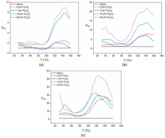 Figure 5 presents the variation of Urelative with temperature at 0.1 Hz for all the nanocomposite systems under investigation. Generally, the energy-storage capability of the nanocomposite materials improves as the filler content increases. This enhancement is attributed to the higher conductivity values associated with the carbon nanoparticles, the elevated dielectric permittivity of the magnetite nanoparticles, and the induced heterogeneity within the systems. A prominent peak observed at high temperatures is ascribed to interfacial polarization, which arises from the accumulation of free charges at the interface between the inclusions and the polymer matrix. Secondary peaks at lower temperatures reflect the variations in the α-relaxation dynamics between the neat matrix and the nanocomposites.
