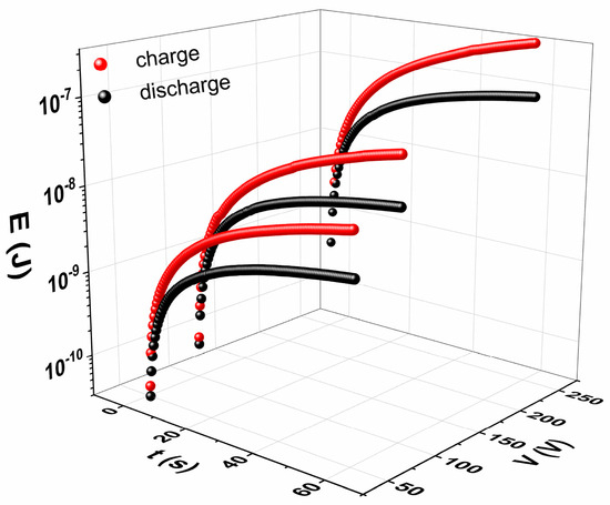 These diagrams confirm the successful process of energy storage and harvesting in the studied systems. All charging curves are above the corresponding discharging curves. The systems quickly reach high values of charging and discharging energy, thus characterizing them as fast-charge/fast-discharge systems. Their ability to promptly store and deliver large energy amounts is desirable in applications requiring high power density as well as the capability for higher charging/discharging currents. The stored and recovered energies rise considerably with the applied voltage, as the applied field lowers the height of the local potential barriers, thereby facilitating charge migration within the nanocomposites in a trapping–detrapping sequence, and also injects more charges.