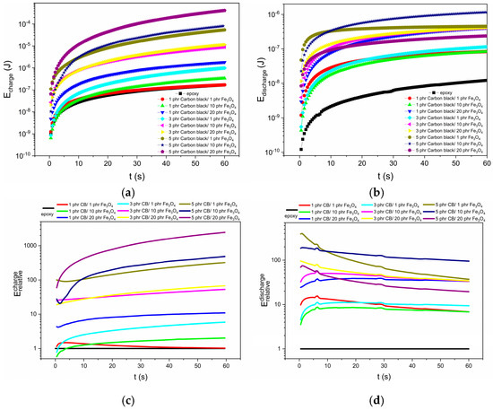 The relative energies for the charging and discharging procedures are defined, in analogy to Equation (2) for the relative energy density, as the ratios of the stored/retrieved energy of each nanocomposite to the stored/retrieved energy of the neat epoxy at the same initial charging conditions. Notably, the nanocomposites demonstrated exceptional energy storage and recovery performance, surpassing the neat-epoxy matrix by several orders of magnitude.