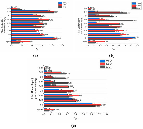 The coefficient of energy efficiency (neff) is defined as the ratio of recovered to stored energy, with the charging voltage and time serving as key parameters [19]. Figure 8 displays the computed neff at identical instantaneous times of t = 5, 10, and 30 s during the charging and discharging processes for hybrid systems reinforced with carbon black and Fe3O4. The coefficient of energy efficiency decreases over time across all systems, validating the rapid charging/discharging nature of the systems studied. The hybrid nanocomposites reinforced with carbon black exhibit the highest neff values at 100 V rather than at the highest applied voltage. The optimal energy efficiency was recorded for the nanocomposite with 1 phr carbon black/1 phr Fe3O4, with a measured coefficient value (neff) of 89.6% at 100 V and 5 s. Although the efficiency coefficient value is very high, it should be emphasized that the assessment of a nanocomposite’s ability to store energy and release it during discharge depends not only on the efficiency coefficient but also on the absolute value of the employed energy, which is influenced by the magnitude of the applied field. Currently, nanodielectrics with high discharged energy density are predominantly based on ferroelectric polyvinylidene fluoride (PVDF)-based polymers [44]. However, due to their substantial hysteresis and ferroelectric loss under high-field poling conditions and significantly decreasing energy efficiency at elevated temperatures, these low-temperature polymers may prove unsuitable for practical high-temperature applications [45].