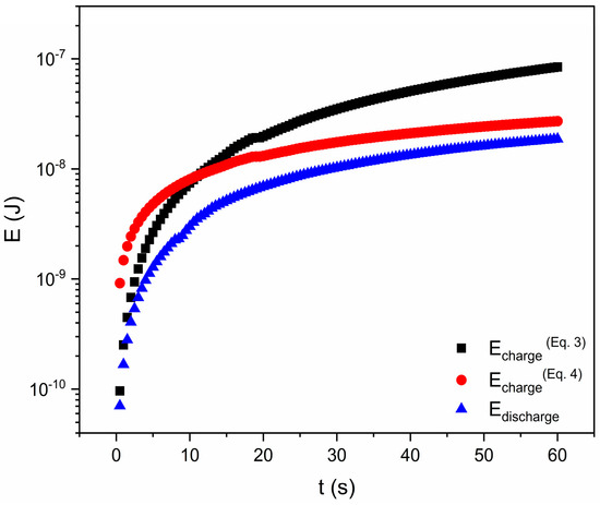 Although this convention is necessary for calculating energy during discharging, where measurements are performed in the absence of applied voltage, the energy stored in the system during charging can be calculated according to dielectric theory [33] by incorporating the time-dependent current functions through Equation (4):