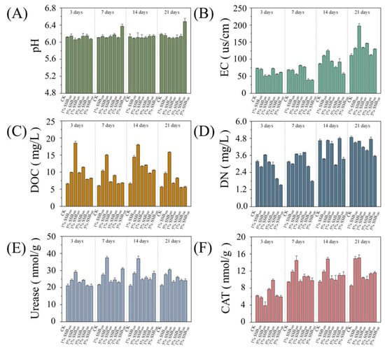 The pH (A), EC (B), DOC (C), DN (D), Urease (E), and CAT (F) in biochar-amended soils.