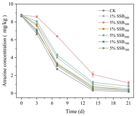 The degradation of atrazine in the sterilized soil decreased in the order 5% SSB300 > 1% SSB300 > 5% SSB500 > 1% SSB500 > 1% SSB700 > 5% SSB700 > CK (Figure S1). After 21 days, atrazine degradation was at most 2.14 mg kg−1 in the 5% SSB300 treatment group, which was 1.59 mg kg−1 higher than that in the CK group. Biochar application generally increased atrazine chemical degradation in the sterilized soil, and this result could be confirmed by electron spin resonance analysis in Figure S2. On the contrary, biochar application inhibited atrazine degradation in unsterilized soil. The degradation of atrazine was in the order CK > 1% SSB700 > 1% SSB500 > 5%SSB700 1%SSB300 > 5%SSB500 > 5% SSB300 (Figure 2). After 21 days of incubation, the concentration of atrazine in the 5% SSB300 treatment group was 1.17 mg/kg, which was 1.00 mg/kg higher than that in the control group. The degradation ratio of atrazine in unsterilized conditions was a combination of both chemical degradation and biodegradation. At the end of 21 days of incubation, the degradation ratio of atrazine in the control in unsterilized and sterilized soils was 98.04% and 5.57%, respectively. In the 5% SSB300 treatment group, 86.63% and 24.62% atrazine degradation were found. Though a little arbitrary, the distinction between sterilized and unsterilized groups was acknowledged as the impact of atrazine biodegradation, a commonly accepted concept in the existing literature [18,52,53]. Consequently, based on the data provided, it can be inferred that biodegradation played a more significant role compared to chemical degradation. Additionally, the introduction of biochar hindered atrazine’s biodegradation within the soil.