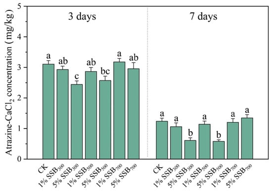 The widespread observation of reduced pesticide biodegradation due to adsorption effects has been noted, and the addition of biochar in soil has been found to enhance the adsorption of pesticides. This is likely to result in a decrease in the availability of pesticides for biodegradation [54,55,56]. Hence, we also investigated the concentration of the bioavailability of atrazine (atrazine-CaCl2) in soils in different treatments. The bioavailability of atrazine in soils is shown in Figure 3. Compared to the CK, the SSB700 groups did not affect soil atrazine bioavailability. In SSB300 and SSB500, biochar application increased the adsorption of atrazine. The bioavailability of atrazine in 5% SSB300 decreased by 0.66 mg/kg on day 3 and 0.63 mg/kg on day 7 compared to the CK. Although SSB500 has a larger BET, SSB300 has a more substantial adsorption capacity for atrazine. Fruehwirth et al. [57] revealed that LT-biochar exhibited an increased abundance of organic functional groups, potentially impacting the adsorption behavior towards atrazine. This dissimilarity arises from inadequate combustion, as biochars generated under lower temperature conditions tend to retain their unique functional groups and structures, unlike those obtained through higher temperature processes [21]. In our study, we did not find any difference between the types of functional groups in LT-biochar and HT-biochar (Figure 4A), and we speculated that the difference in adsorption capacity may be caused by the number of functional groups. Zhao et al. [58] revealed that the hydrophobicity and low polarity of biochar facilitated atrazine adsorption. As shown in Figure 4B, SSB300 has lower hydrophilia, which can also explain the reason why LT-biochar has a stronger adsorption of atrazine. We did not detect the bioavailability of atrazine because the concentration of atrazine is below the quantitative detection limit (0.01 mg/L) on days 14 and 21 for all treatments.