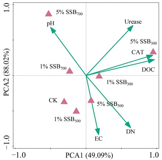 The principal component analysis (PCA) in soils from different treatments. DOC: dissolved organic carbon; DN: dissolved nitrogen; CAT: catalase; EC: electrical conductance.