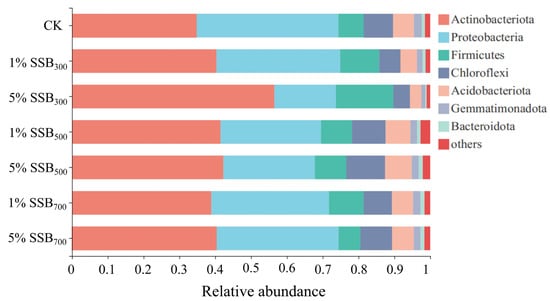 According to the results of PCA (Figure 5), the first principal component (PC1) accounted for 49.04% of the total variance, and PC2 accounted for 88.02% of the total variance. Moreover, DOC, CAT, and urease were the top three parameters that affected the soil microbial community structure. The phylum-level classification of soil microbial composition is displayed in Figure 6. Biochar application increased the abundance of Actinobacteriota (4.09–21.72%) compared to CK, especially for 5% SSB300. HT-biochar (SSB500 and SSB700) contributed to increasing the abundance of Actinobacteriota (0.06–1.61%), Bacteroidota (0.07–0.23%), and Chloroflexi (0.70–2.63%) compared to CK, while LT-biochar (SSB300) caused opposite results.