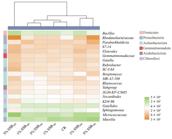 Heatmap clustering based on the top 20 genera in all groups is shown in Figure 7. Among them, nine, six, and two genera belong to Actinobacteriota, Proteobacteria, and Chloroflexi, respectively. The other three genera (Subgroup, Bacillus, and Gemmatimonadaceae) belong to Acidobacteriota, Firmicutes, and Gemmatimonadota, respectively. LT-biochar amendment significantly increased the relative abundance of Bacillus, which was 1.87–2.95 times higher than CK (Figure 7). The higher addition rate of SSB300 led to the higher relative abundance of Bacillus. A similar finding was also reported in a previous study [62], in which LT-biochar increased the abundance of Bacillus more significantly than HT-biochar. Bacillus is an anaerobic bacterium that can degrade atrazine [63,64]. Ding et al. [62] revealed that the increased relative abundance of the Bacillus might be attributed to the higher content of DOM in LT-biochar. In contrast, the relative abundance of KD4-96, MB-AZ-108, Gemmatimonadaceae, and Massilia was enhanced by HT-biochar amendment. Among them, Massilia was aerobic, which prefers to live in larger pores (>5 µm) with more nutrients and air [45]. HT-biochar has a larger pore size, providing Massilia with a more comfortable habitat and the air, thus promoting its growth. Additionally, biochar decreased the relative abundance of Sphingomonas in all treatments. In a previous study, Sphingomonas was positively correlated with atrazine degradation [28]. In this work, the relative abundance of Streptomyces was induced to increase with LT-biochar application but not obviously in HT-biochar treatments. Saez et al. [65] found that the inoculation of bio-mixtures with Streptomyces induced atrazine removal. With biochar amendments, no regular changes were observed in Nocardia, which was reported as an atrazine-degrading bacterium in a previous study [66].