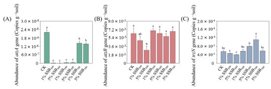 The DNA extraction method was the same as in Section 2.7. Three atrazine degradation genes, atzA, atzB, and trzN, were selected for relative content determination. Primers refer to the reports of Mulbry et al. [34] and De Souza et al. [35], and detailed primers are provided in Table S3. Wcgene Biotechnology Co., Ltd., Shanghai, China, provided sequencing.
