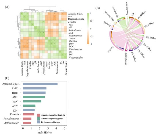 At present, atrazine degradation genes have been extensively explored. The gene atzA, encoding atrazine chlorohydrolase [EC:3.8.1.8], and trzN, encoding triazine hydrolase [EC:3.5.4.32], induces the dechlorination of atrazine to form hydroxyatrazine in the first step. Subsequently, atzB, encoding hydroxydechloroatrazine ethylaminohydrolase [EC:3.5.4.43], catalyzes hydroxyatrazine to form N-isopropylammelide [68]. Finally, other genes (atzC, atzD, trzN, atzE, and atzF) are further involved in N-isopropylammelide metabolism. To further explain the mechanisms for the changes in atrazine biodegradation with biochar amendment, the abundance of the atzA, atzB, and trzN genes was quantified. As shown in Figure 8, biochar addition significantly decreased the abundance of atzA in all treatments. SSB300 amendment led to a significant decline in the abundance of atzB (p < 0.01) and trzN, suggesting that SSB300 inhibited the atrazine-degrading bacteria. And the inhibition was more significant with the increase in addition rates. Through Pearson correlation analysis, we found that atzA was significantly correlated with the abundance of Pseudomonas (Figure 9A), which also indicated that in this experiment, Pseudomonas contained degradation genes, which played a role in degrading atrazine.