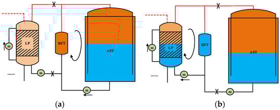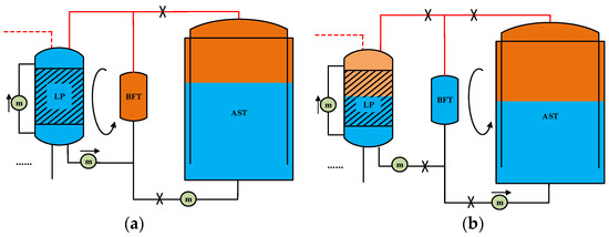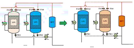 The total liquid inflow to LP2 is , which comprises the liquid inflow from LP1 and BFT. represents the liquid inflow from LP1 through hydraulic cylinders, which is used to compress air. represents the liquid inflow from BFT, which is used to transfer liquid from AST, resulting in the following: