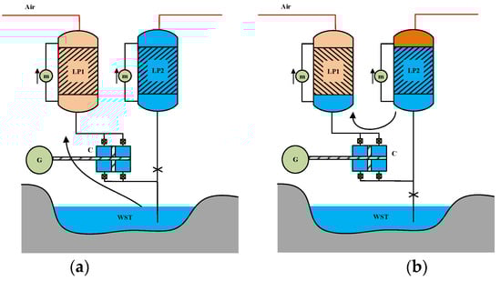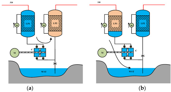During energy storage cycle, the hydraulic cylinder first operates in CPP mode (Figure 3a), transferring liquid from LP1 to LP2 to compress low-pressure air by linear drive. Subsequently, it switches to CPW mode (Figure 3b) to discharge excess liquid to the WST.