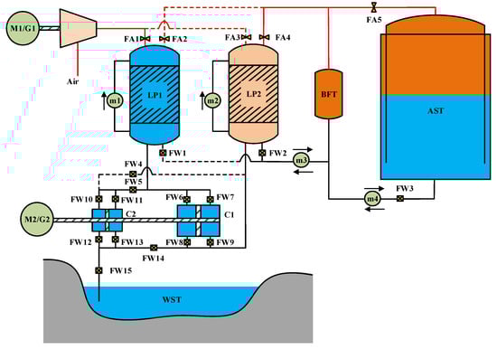 In Figure 5, BFT means buffer tank, LP means liquid piston, AST means air storage tank, and WST means water storage tank. FA1~FA5 are air valves. FW1~FW15 are liquid valves. m1~m4 are auxiliary water pumps, where m1 and m2 are auxiliary spray water pumps for liquid pistons, and m3 and m4 are auxiliary migration water pumps for buffer tanks.