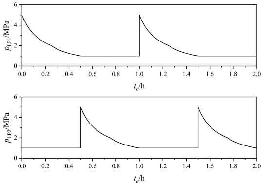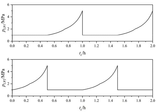 Figure 13 shows air pressure variation in LP. In the first cycle, LP2 maintains 1 MPa, while the air pressure of LP1 is decreased from 5 MPa to 2 MPa in CPW mode (0~0.25 h), dropping rapidly from 2 MPa to 1 MPa in CPP mode (0.25~0.5 h) because of C1 and C2 being driven jointly. Similarly, BFT’s mode transitions do not influence LP1’s pressure dynamics.