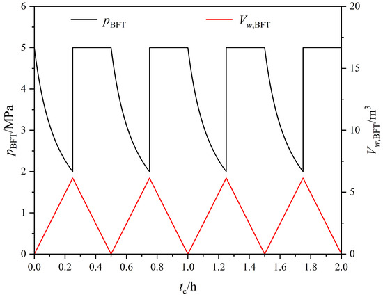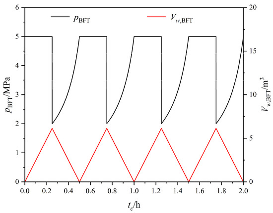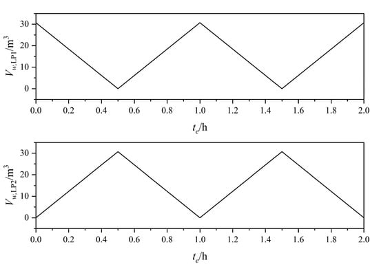 Figure 14 depicts the air pressure and liquid volume dynamics of BFT. Initially filled with high-pressure air of 5 MPa, BFT operates in CBP mode, expanding air from 5 MPa to 2 MPa with LP1 jointly, so that the air pressure of BFT aligns with that in LP1. After 0.25 h, BFT filled with liquid switches to CBA mode, receiving high-pressure gas of 5 MPa from AST. The liquid of BFT is gradually drained.