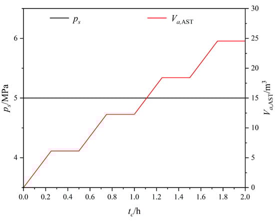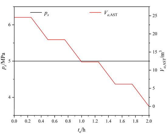 Figure 15 presents AST’s air pressure and volume. Pressure remains constant at 5 MPa, with air volume stabilizing during CBP mode and decreasing during CBA mode (outflow: 0.0068 m3/s).
