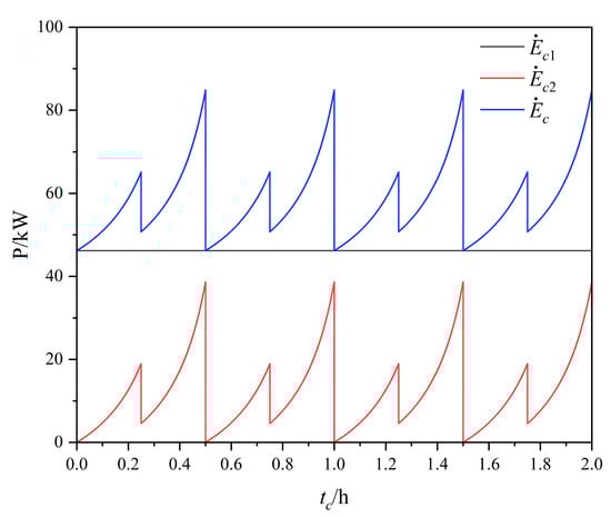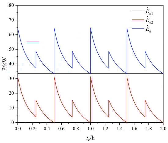 Figure 16 displays the power curves of the system, including the power of the low-pressure expander and the power of the liquid piston linear generator. The low-pressure expander operates steadily at 33.4 kW with an efficiency of 85%. The linear generator exhibits periodic power fluctuations from 31.3 kW to 3.7 kW in CPW mode and from 15.3 kW to 0 in CPP mode. This is because C1 and C2 act simultaneously to generate electricity after the mode switches, which increases part of the driving force and increases the power from 3.7 kW to 15.3 kW. In general, the power of the system fluctuates twice in the cycle. The total power output is 64.7~37.1 kW under CPW mode and 48.7~33.4 kW under CPP mode. The maximum power out of linear motor accounts for 48.4% of the system.