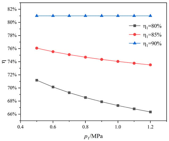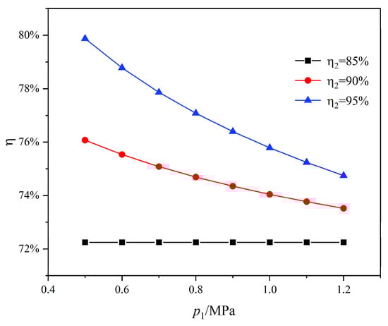 The efficiency of the system depends on the efficiencies of the low-pressure compressor/expander and liquid piston compressor/expander, as well as related to the pressure setting of low-pressure air p1. Generally speaking, due to the better isothermal effect of the liquid piston, the operating efficiency of liquid piston compressor/expander is higher than that of the low-pressure compressor/expander. With the increase in the low-pressure air’s pressure, the efficiency of the system will decline for the higher energy proportion of the low-pressure equipment. The greater the efficiency gap between the two parts, the more obvious the decline in system efficiency.