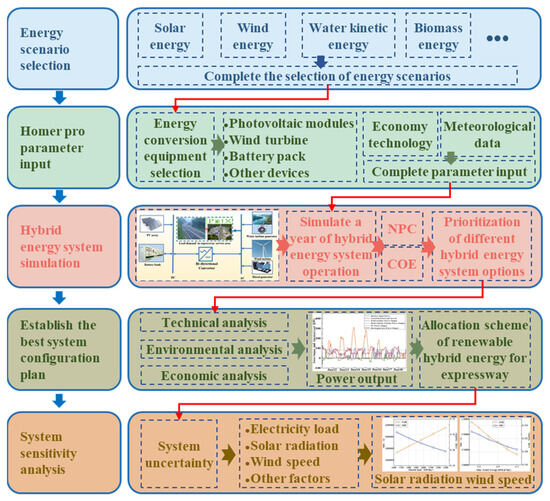 The development of the expressway hybrid renewable energy system began with the selection of suitable energy scenarios along the highway corridor, based on a comprehensive assessment of locally available renewable resources. Subsequently, the HOMER Pro 3.14 software platform was employed to simulate all feasible configurations of hybrid systems by integrating annual load profiles, site-specific resource data, and the technical and economic parameters of the system components. These simulations generated an array of system combinations, which were then ranked according to their cost-effectiveness. Detailed techno-economic analyses are conducted for each configuration to identify the optimal system architecture. Finally, a sensitivity analysis was performed to evaluate the system’s robustness under varying resource and demand conditions. The overall configuration process is illustrated in Figure 1 below: