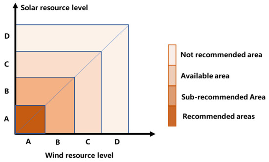 A two-dimensional preliminary screening model can be established based on wind resource and solar irradiance classifications, dividing the region into four evaluation levels, as illustrated in Figure 2: